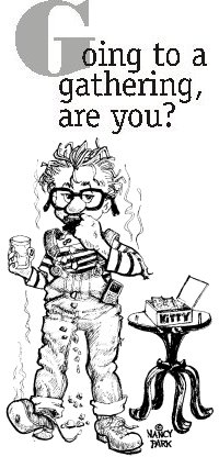 People socialize during this initial period. Think of this as an opportunity. Conversation should be light and general at a meeting. Go to where most of the people are. There may be a chair to sit in, but probably they are already taken. You can stand for a little while. Take small bites of your food. A bite is the size of a chocolate truffle, no larger. It does not require opening your mouth wide to insert it. Keep your lips closed while you chew and swallow. If someone asks you a question or you have something to contribute to the conversation, finish your bite and swallow before you talk. You will definitely be the moment's sensation if you chew with your mouth open or have the food still in your mouth while talking, but we are trying to Avoid this particular type of attention. Also, do not touch the people around you unless invited. No one wants to be hugged and have your food go down their back simultaneously. In fact, they might not want to be hugged at all. You know if you are the one who tries to cop a feel in the hugging ceremony: YOU STOP THAT DISGUSTING BEHAVIOR IMMEDIATELY! Do not even Think about trying to cop a feel of Granny. She has nothing left of which to cop a feel.