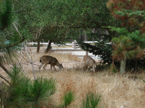 ![]() In late afternoon, the fawns that had been snoozing during the day came out to browse right outside Madrone. Mama deer is out of view to the left. |