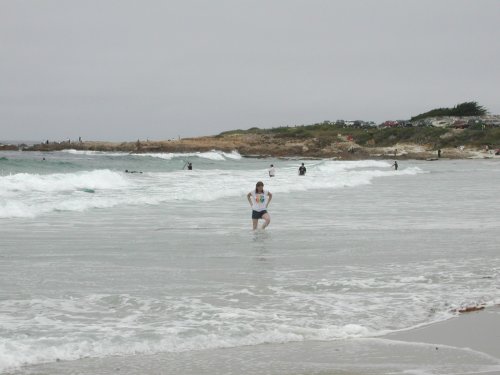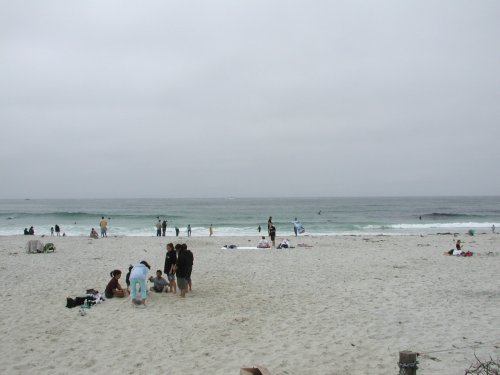 ![]() The girl in the middle of this picture must have been coldthe average water temperature is about 56°, as I recall. From the look of the surf and the level of the water, it must have been pretty near full high tide, way too much water to take pictures in the tide pools in the rocks on the point. |
