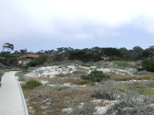 ![]() So, it was back up the boardwalk to the Asilomar grounds. The building on the left is Chapel; the roof you can barely see to the right is the dining hall. And yes, that is a bit of blue sky showing through. It didn't last long, though. |