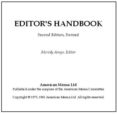 Posted January 2002 As a public service, Dick and Meredy Amyx are pleased to offer an online version of the 1982 edition of the American Mensa Editor's Handbook (Rev. 0.1, slightly revised and spiffed up). Some chapters or portions of chapters contain information that is still applicable and relevant or that can be updated with none but the most minor changes. Others may be of interest for historical reasons. Those that are completely out of date and contain nothing that in our judgment has current value are posted for the sake of completeness, but with minimal content. The files are in PDF format; editors are invited to download anything