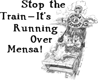 In his first paragraph Ryan called "ordinary" Mensans (i.e., anyone not elected or appointed to the American Mensa Committee [AMC]) "paying passengers on a locomotive" with an undesirable destination and snotty porters. In reality, I think, we're not even baggage: We're simply the (paying) fuel now. We mere lumps of coal might hope someday to become diamonds of the first water but who cares what supplies want?