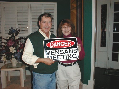 TJ Lundeen presents to Don Taylor, Panhandle Mensa's first LocSec, a gift befitting the group's first birthday.