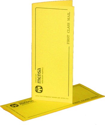 Recruitment Brochure This is the "yellow brochure." The yellow brochure and its predecessor, the "brown brochure," were American Mensa's primary recruitment tools from about the late 1960s or early 1970s to the early 1980s. (We'd like to hear from anyone who can pin the dates down better than that.) The content of the yellow brochure and the brown brochure was substantially the same. Names of AMC members changed with each administration, and names of qualifying tests and test score equivalents may have been added over time. Click the brochure to read its text in html. Click here to see a coarse pdf representation of the original. [ Mensa Index ] |